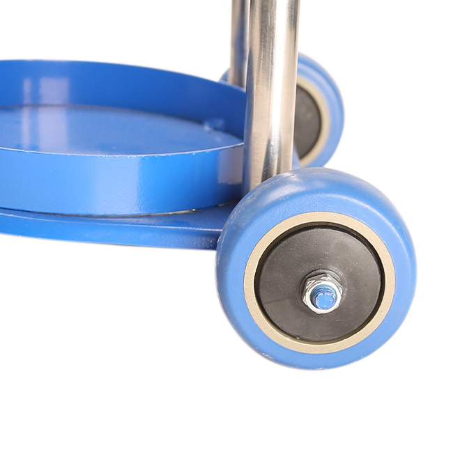 Heavy-duty, 11-gauge (3-mm) floor plate with safety fins prevent warping or breaking. Features unique zero-lift height loading, allowing floor plate to lay flat, thereby eliminating the need to lift cylinder during loading and unloading. Caster carriage features heavy steel bars and nylon washers for smooth folding action and easy storage in tight spaces. Corrosion-resistant powder-coat finish throughout for long life and smooth handling. Upper handle sections bolt in place for reduced package size in order to save on freight costs.